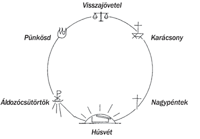 ÁLDOZÓCSÜTÖRTÖK: felméne mennyekbe, ül az Atya Isten jobbján (húsvét utáni 40. nap)
