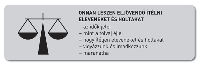 földrengések, elnyomások, hamis próféták és hitetők, az Antikrisztus; és az evangélium hirdetése az egész világon. Az egyház, mint Krisztus menyasszonya várja vőlegényének visszajövetelét. így imádkozik: maranatha = Urunk jöjj!