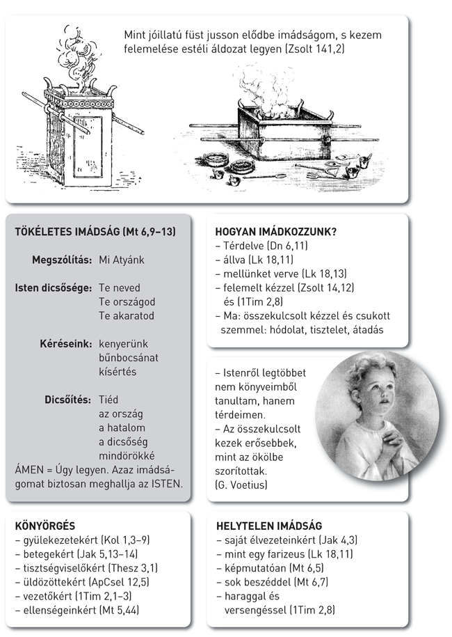 Megkülönböztetünk kérő imádságot, hálaadó imádságot és közbenjáró imádságot. Istentől mindent kérhetünk, amire szükségünk van: testieket és lelkieket egyaránt. Mégis jó, ha egy meghatározott sorrendet tartunk, úgy ahogy Jézus tette a tökéletes imádságban: A Miatyánkban. Hogy imádságunkat ÁMEN-nel fejezzük be, azt jelenti, hogy bizonyosak lehetünk arról, hogy imádságunkat Isten hallja és meghallgatja. Teljes bizalommal imádkozhatunk Istenhez, de ugyanakkor mély tiszteletet kell tanúsítanunk Isten szentsége iránt. Mindkettőnek meg kell látszani imádságunkban. Összekulcsolt kezünk a jele a tiszteletnek és a magunk átadásának, melyet az Úr kér tőlünk.